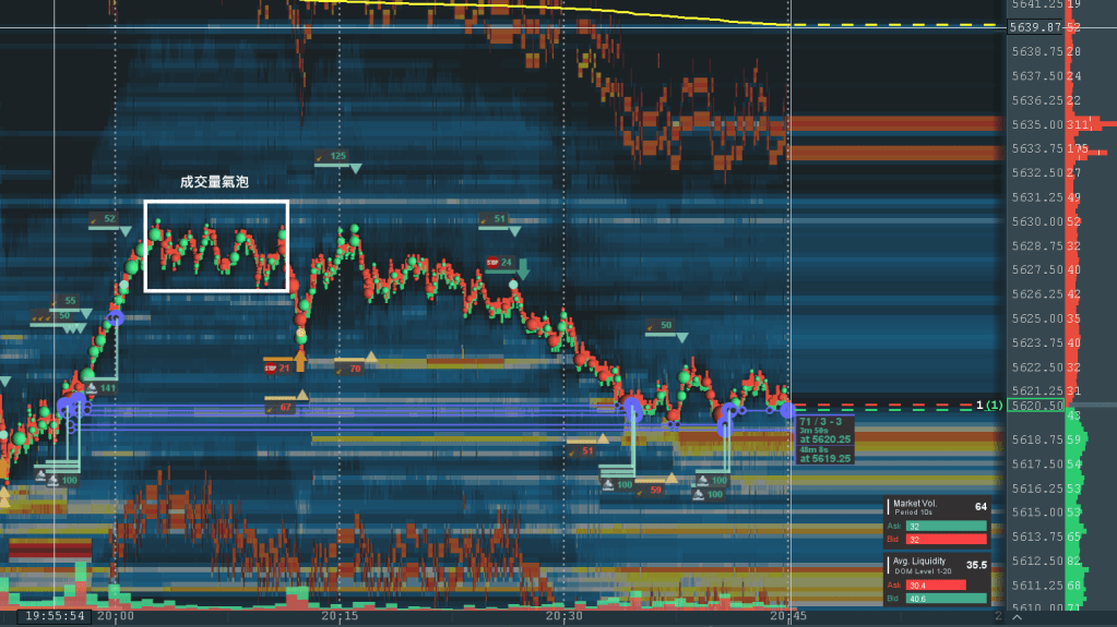 成交量圓點與成交量差可即時顯示於圖表上,無需等待 K 線完成,即可掌握市場動態。