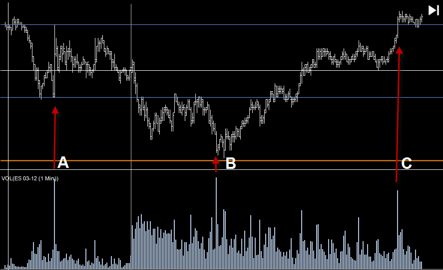 我們可以看到,在上午新聞發布時,成交了 20,000 口合約(A)。當天另外兩個時段,我們也看到了大量成交——「B」與「C」。在後面這些高成交量的時間點,合約數同樣很多,但價格本身的波動要小得多。A 點的那根 K 棒波幅(Range of the Bar)為 7 點。價格在 1 分鐘內就能走出 7 點!