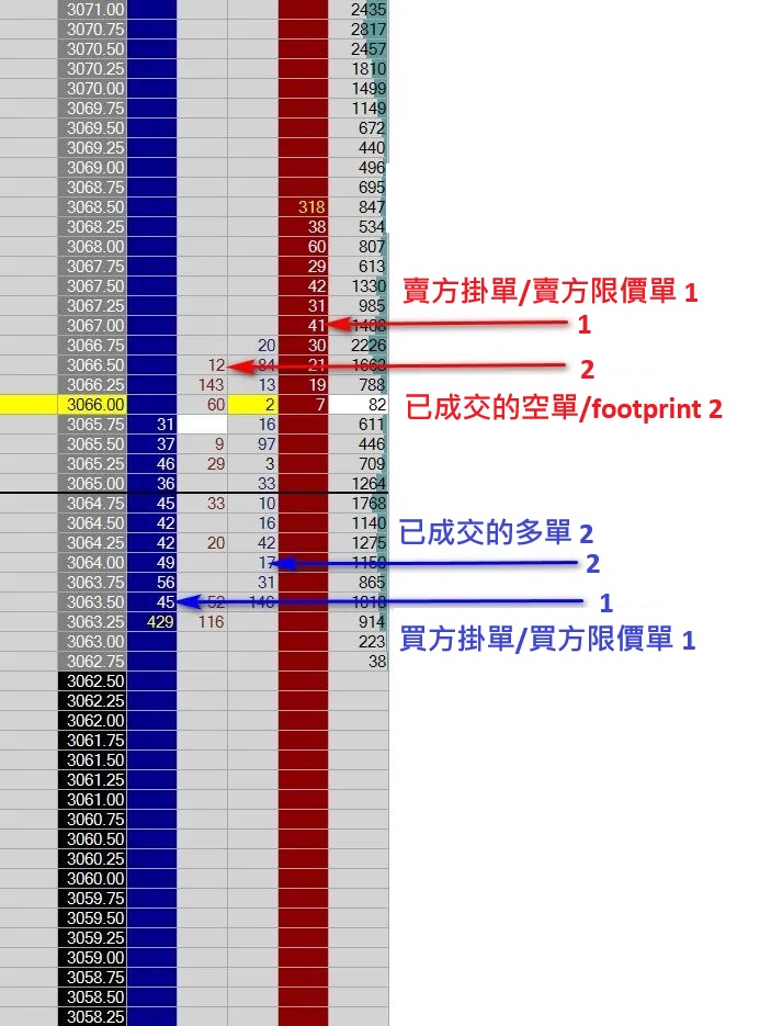 在下圖中,你可以在市場深度(DOM)看到流動性消耗者與流動性提供者。我們能看到現有的限價單,也能看到當前價格成交的多單與空單。