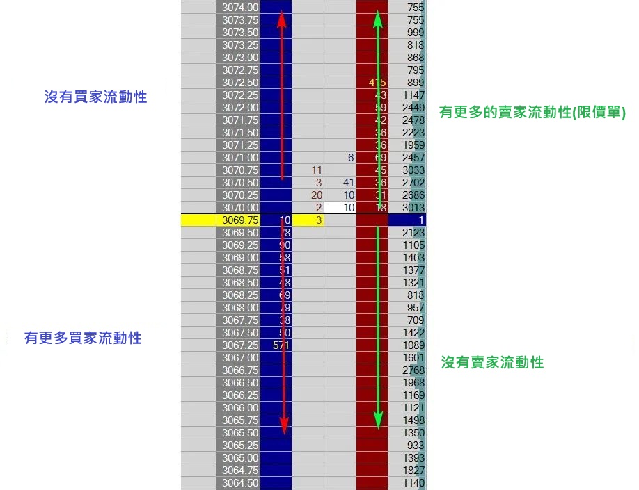 不存在「低於當前報價的賣方流動性」,也不存在「高於當前報價的買方流動性」。如果這點還不夠清楚,請看下面的圖片: